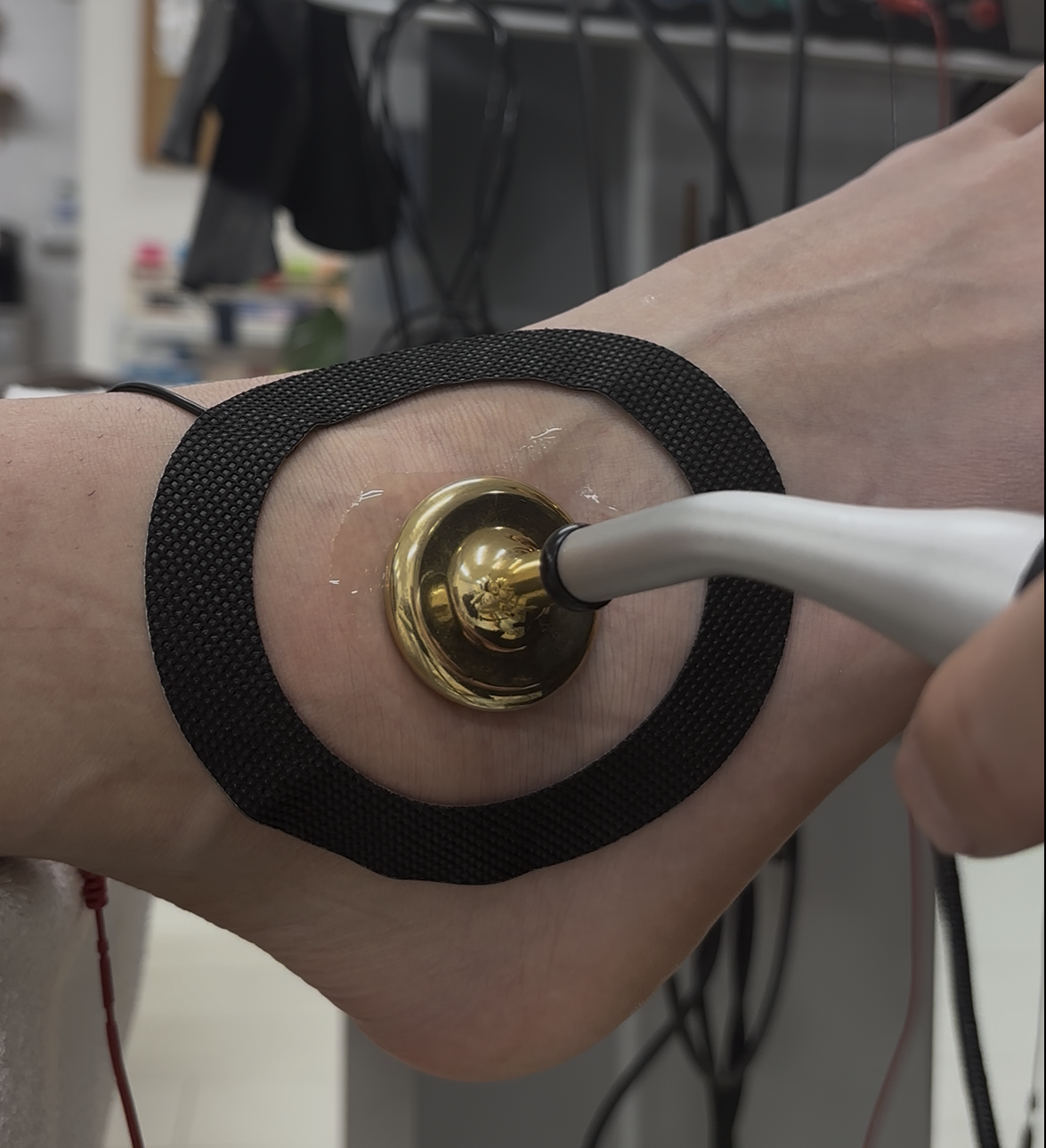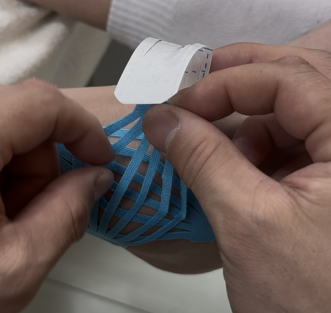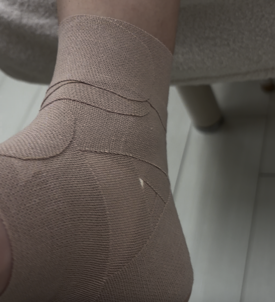 - 固定法:週末の試合出場を考慮。解剖学的走行を補強しつつ可動域を確保するため、キネシオテーピングおよび伸縮テープによる機能的固定を採用。バイオメカニクスに基づき、内反・底屈を制限しつつ背屈運動を許容する。