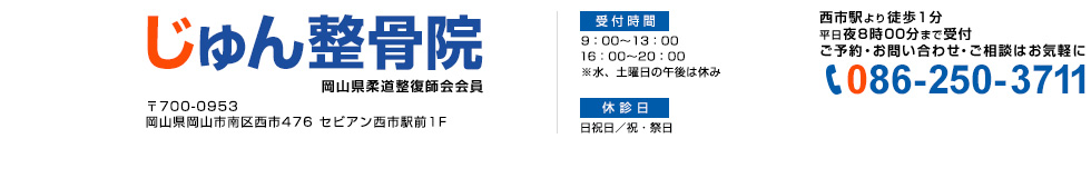 ナビ設定:「じゅん整骨院」もしくは「岡山市南区西市476」