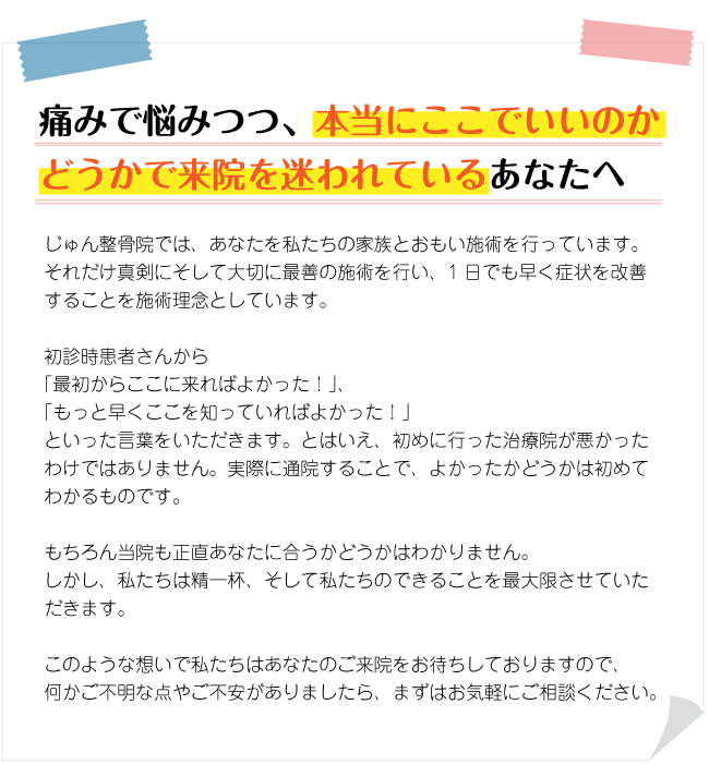 というのも、実は現在当院に通われている患者さんの多くもはじめはそうでした。あなたと同じように悩み、そして不安を抱えながら当院を受療されていました。